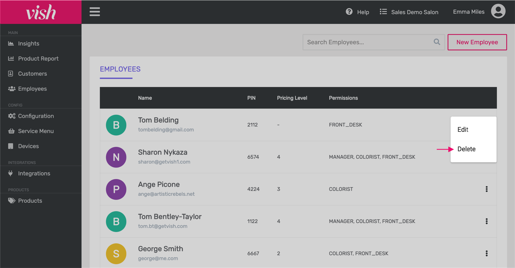 Locate the employee account you would like to delete by using the search field, located in the top right, or by navigating the employee list.