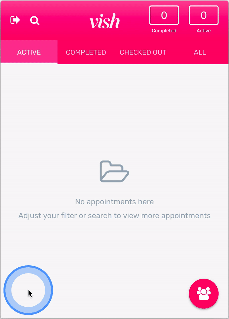 Locate the top bar of Vish Front Desk, where you can find the number of Active and Completed appointments for the current day. Click on either of these boxes to maximize or minimize the Vish Front Desk window. The Vish Front Desk app is meant to always be visible, but minimized when not in use.