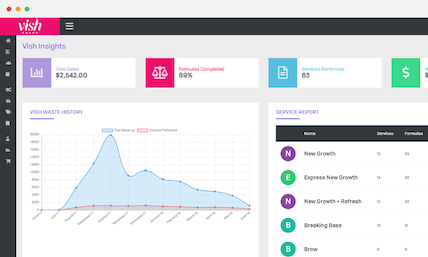 El Vish Dashboard ofrece perspectivas sobre el negocio de coloración de un salón; reportes clave sobre uso, desperdicio y aplicaciones, además del rendimiento de los miembros del equipo y registros de huéspedes.